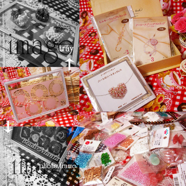 フォトフレームっぽいものにはレーザー加工されたシートが入っているのでそのまま飾るもよし、つっかえ棒を外してケーキトレーにしちゃうのもよし(ニセモモは五つもケーキ持ってないので切り取ってしまいましたが本来は切り取らずに使うものらしいです。)、写真を入れてフォトフレームにしちゃうのもよしです。こちらもビーズマニアさんの商品でっす