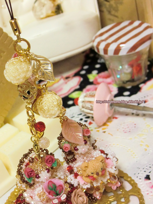 丸大ビーズで作られていて、通常のくまさんよりも大きめサイズなので、かばんやケータイにつけたら目立ち、ます